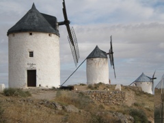 トレドから約65キロ(1時間半)、どこまでも続く褐色の大地の中に、小さな丘にあるコンスエグラという街に着く。「ドン・キホーテ」の舞台となったラ・マンチャ地方の街だ。丘の上までバスが行ける。周りは地平線まで褐色の大地だが、この丘だけは盛り上がるように、そしてその頂上に白い風車群がまるで作られた観光地のように立っていた。この地域の主要農産物は“サフラン”という。